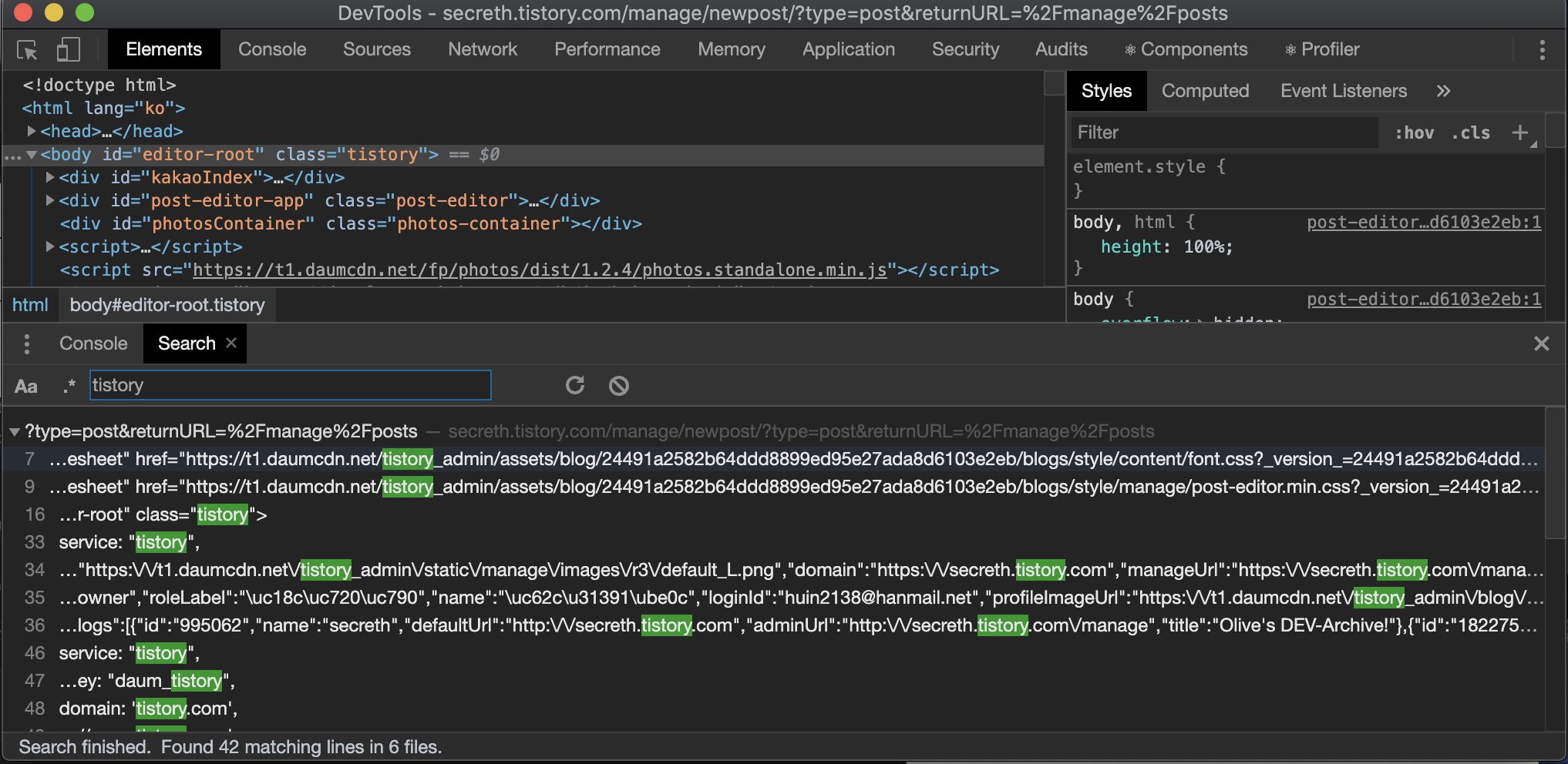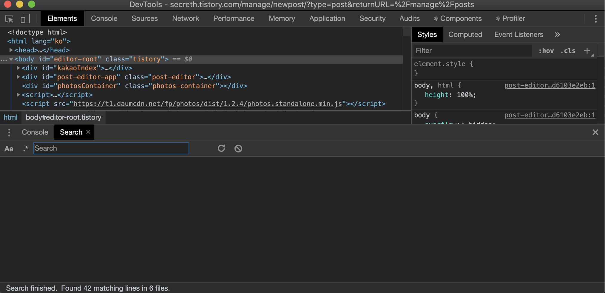 4. ๊ฒ์ํ๊ธฐ ์ํด์๋ F12 ๊ฐ๋ฐ์๋๊ตฌ๊ฐ ์ผ์ง ์ํ์์ (์๋์ฐ) Ctrl + Shift + F (๋งฅ) Command + Option + F ๋ฅผ ๋๋ฅธ๋ค. ๊ทธ๋ฌ๋ฉด ํ๋จ Console ํญ ์์ "Search"๊ฐ ์๊ธฐ๊ณ ๊ฒ์ํ ์ ์๋ ์ธํ ๋ฐ์ค๊ฐ ๋ํ๋๋ค.