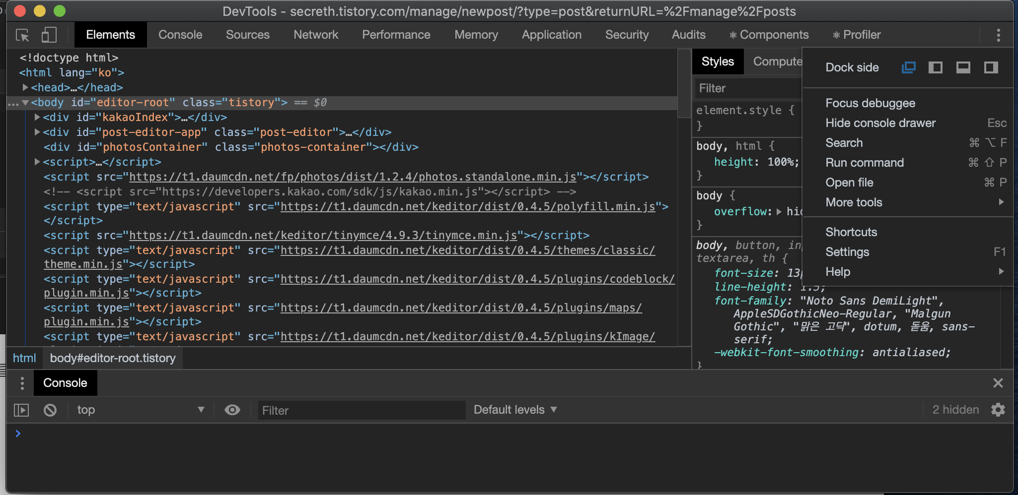 2. ์ฐ์ธก ์๋จ์ ์ ์ธ๊ฐ (Customize and control DevTools) ํด๋ฆญ > Settings ํด๋ฆญ