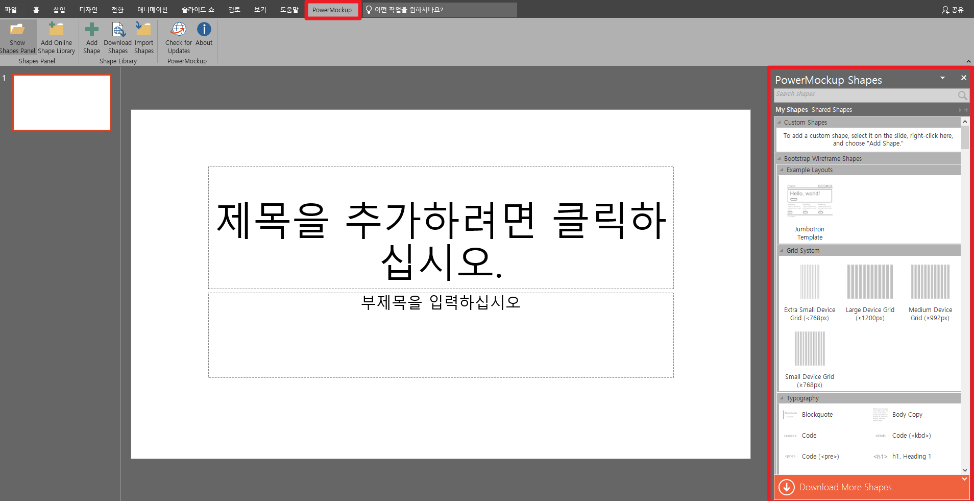 ์๋ง๋ ๋๋ฅด์๋ง์ [Show Shapes Panel]์ด ํ์ฑํ๋์ด ์๋ ๊ฒ์ฒ๋ผ [PowerMockup Shapes] ํจ๋์ด ํ์ฑํ ๋ผ์.